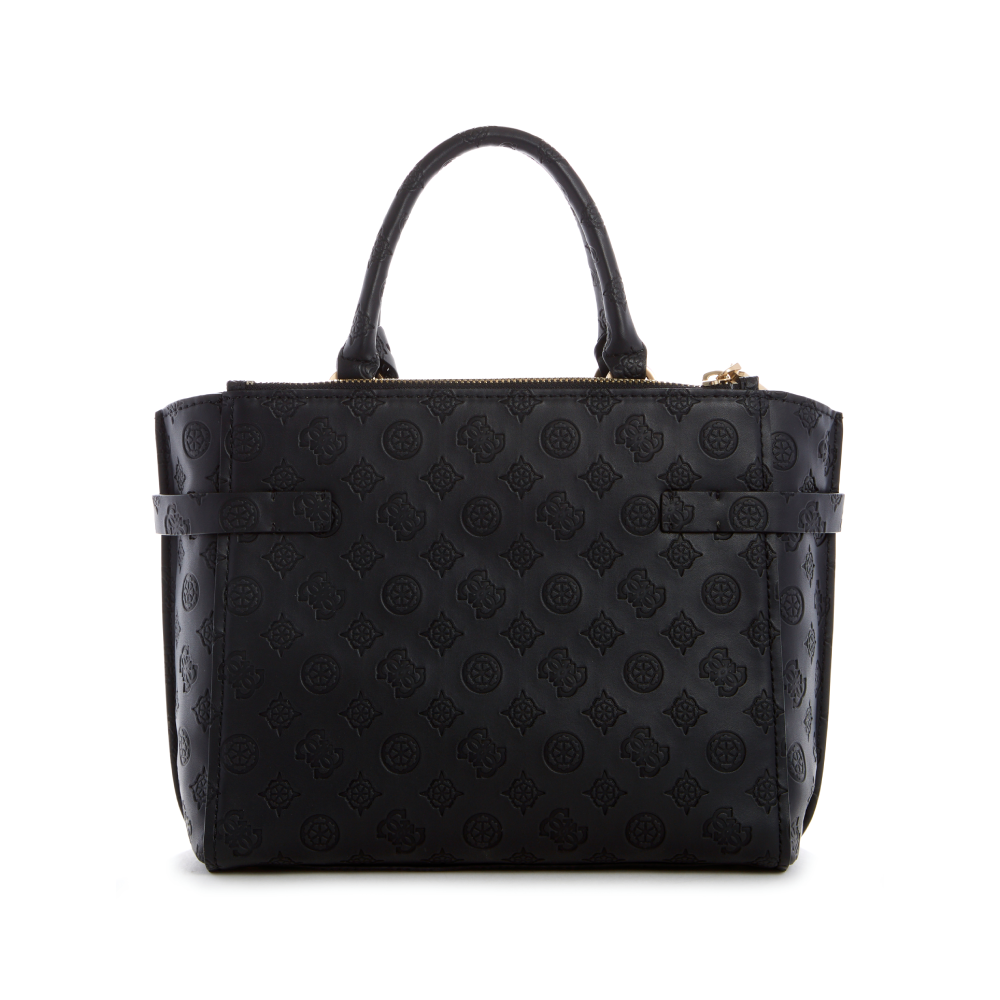 • This versatile satchel is structured with a divided interior with belted logo emblem at front and detachable crossbody strap.